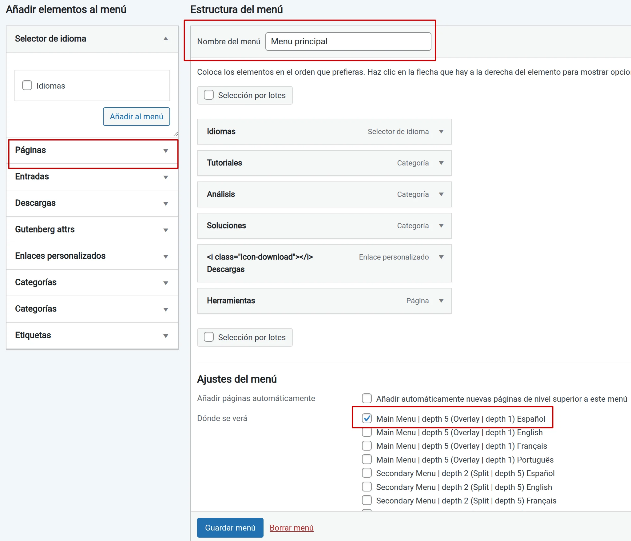 - Especifica que éste será tu menú principal: Abajo en «Ajustes del menú» en el apartado «Dónde se verá» encontrarás una lista que indica varias posiciones para colocar el menú. Según el Theme puede mostrar más o menos posiciones (principal, secondary, footer, left, split left, split right, etc). Marca el ☑️ llamado «Main menu» o equivalente. Esto sustituye el menú automático y aplicará tu menú personalizado.