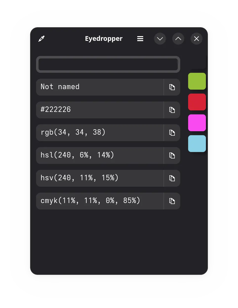 Eyedropper | Alternativa ao Just Color Picker. Seletor de cor da tela para mostrá-la em hexadecimal. Pode salvar uma lista de cores. https://apps.gnome.org/es/Eyedropper | |